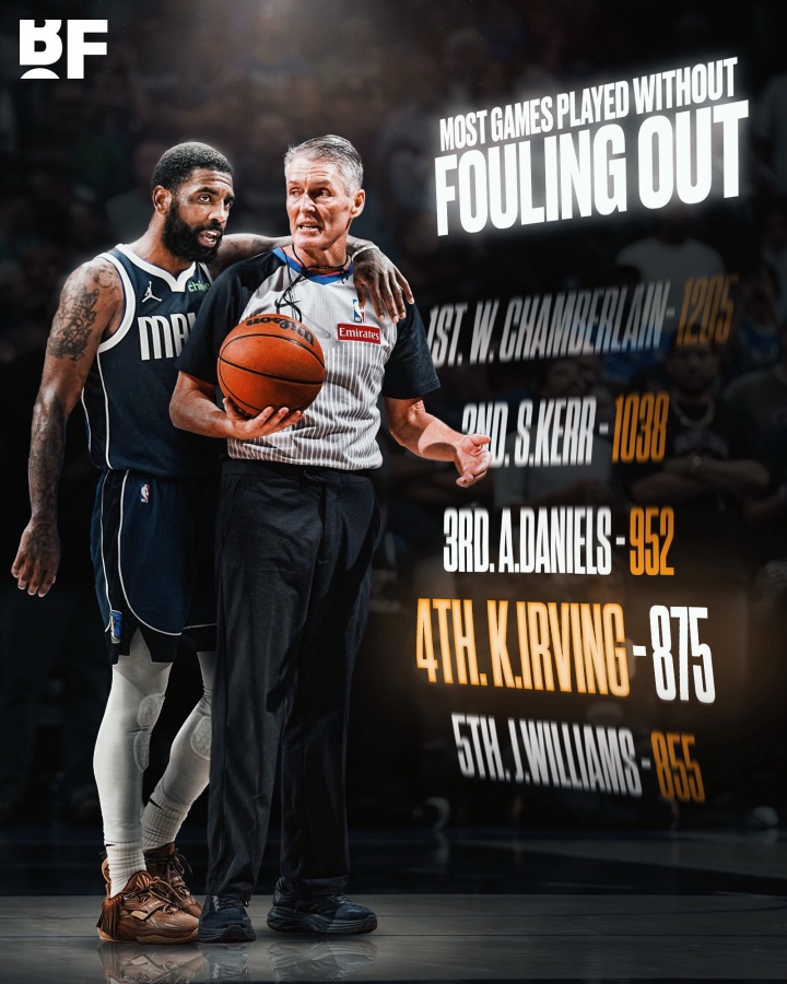 08月31日讯 今日,美媒Basketball Forever列出了一项与独行侠后卫凯里-欧文有关的数据——欧文NBA生涯至今从未犯满离场(包括常规赛和季后赛):