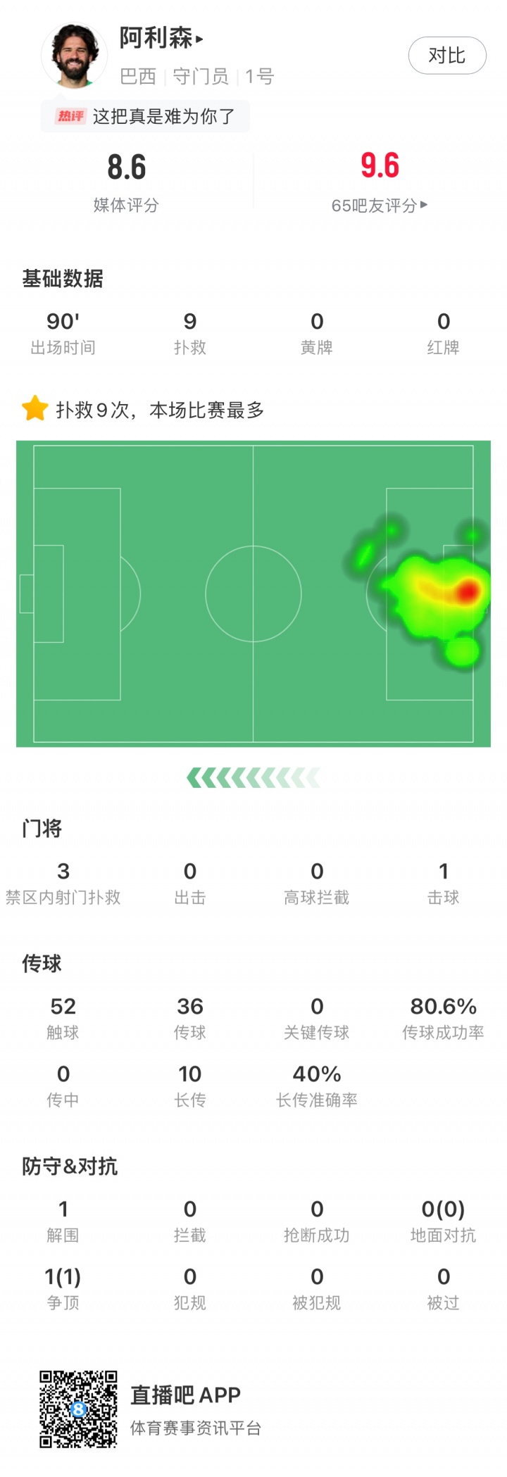 南美区世预赛最后一轮,巴西队客场0-1负于玻利维亚,门将阿利森完成9次精彩扑救。本场玻利维亚全场23次射门其中10次射正,阿利森唯一未能扑出的进球来自对手的点球破门。
