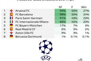 体育资讯04月10日讯 欧冠1/4决赛首回合战罢,数据机构Football Meets Data通过1万次模拟得出了最新的8强晋级以及夺冠概率。